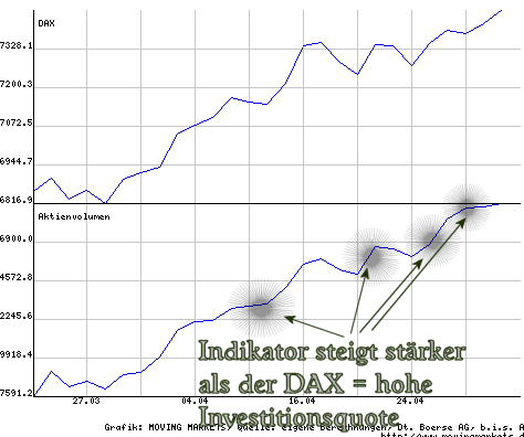 Der Gesamtmarkt-Volumenindikator kletterte stärker als der DAX, Mitte April beginnend. Dadurch wird eine hohe Investitionsquote der Marktteilnehmer signalisiert.