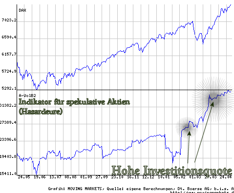 Die Optimisten/Hasardeure kauften seit Mitte März den DAX nach oben. Allerdings floss viel Kapital in den spekulativen Bereich, so dass die Investitionsquote stark gestiegen ist. Im Februar führte das schnell zu einem Rücksetzer. Zurzeit haben die Hasardeure ungewöhnlicherweise mehr Geduld: Sie sitzen schon seit März auf ihren überdurchschnittlich großen Aktienpaketen.